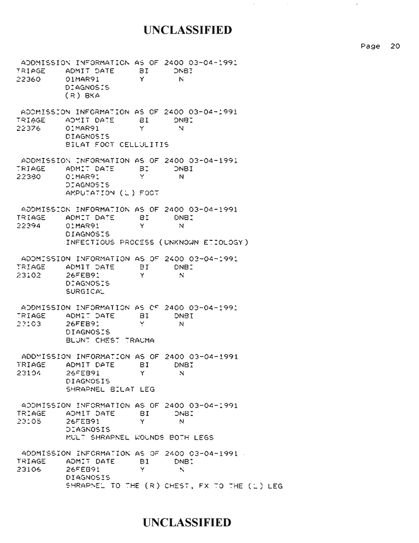 Document 34 f:/Week-42/BX300118/FOLDER 2 - PATIENTS TREATED - AL KHANJAR TRAUMA CENTER MAR 91/admission information as of 2400 03 04 1991:1112:1112961728162