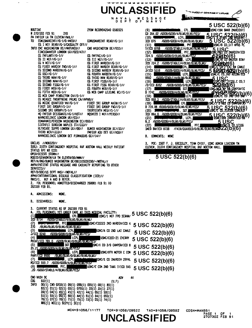 Document 1 f:/Week-41/BX300103/FOLDER MESSAGE CHRONOLOGICAL FILES 13 FEB 4 MAR 91 15 OF 20/310 contingency hospital weekly patient status r:1112961011036