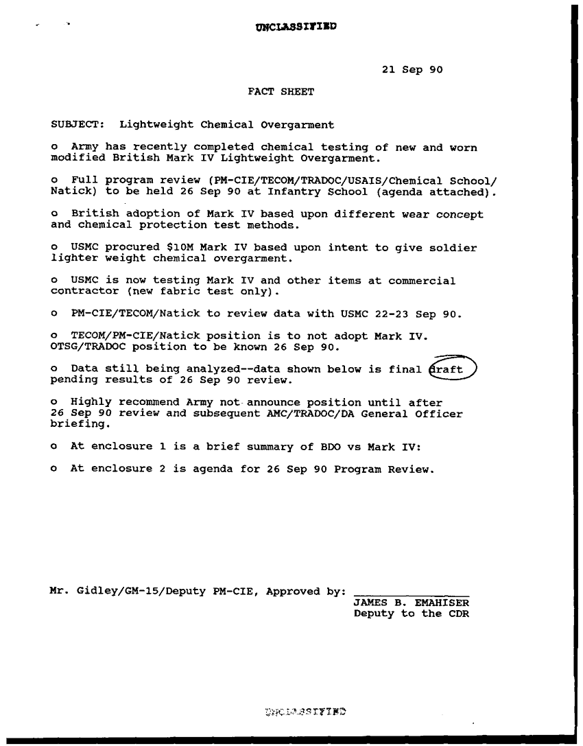 Subject = LIGHTWEIGHT CHEMICAL OVERGARMENT 21 SEP 90