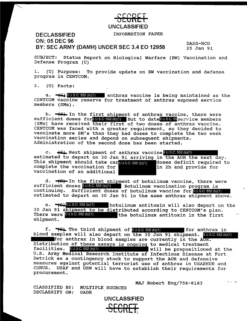 Subject = STATUS REPORT ON BIOLOGICAL WARFARE VACCINATION