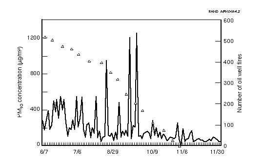Daily PM10 concentrations varied dramatically, from less than 100 �g/m3 on one day to 1200 �g/m3 the next, as illustrated in Figure 4.2. The chart also shows the rate at which the oil fires were extinguished (triangles).
