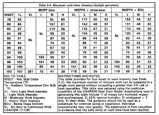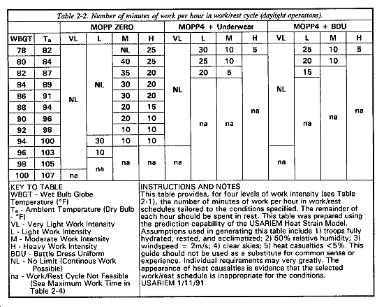 If the commander considers MOPP4 for the 3d platoon, a review of Table 2-2 indicates that a work/rest schedule is inappropriate (no work/rest cycle is recommended for heavy work in MOPP4 at a WBGT reading of 80�F), and Table 2-4 shows that continuous work of only 32 minutes would be possible before incurring an initial risk (5 percent) of heat casualties.
