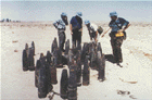 During UNSCOMs inspection of the road in front of the bunker with the security fence, it noticed a repaired area that had obviously been hit by a bomb. The repaired area was still surrounded by rubble from the damaged section of the original roadway.[24] In examining the rubble, the inspectors discovered three intact 155mm artillery rounds which, based on visual inspection, they assumed to be mustard-filled.[25] During a subsequent visit to Ukhaydir, later in 1997, UNSCOM inspectors discovered a fourth intact, mustard-filled 155mm artillery round in the rubble around the repaired bomb crater.[26]