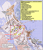 Although there were a number of facilities in the quadrant to the southeast of Camp 13 that could have produced the cloud, it could have come from other locations and been carried on the wind to the location where it was first sighted (Figure 11). Except for a housing area and a few isolated buildings and water towers, the southwest quadrant was virtually empty and therefore an unlikely origin of the cloud. The northwest quadrant contained cement and steel fabrication plants, but such facilities generally do not emit gases. The northeast quadrant, however, contained more gas-producing facilities than any quadrantthree fertilizer plants, three methanol plants, and four petrochemical plants. Two of the three fertilizer plants were within 1,000 meters from Camp 13s northeastern boundary. One plant was as close as 500 meters from the camp.