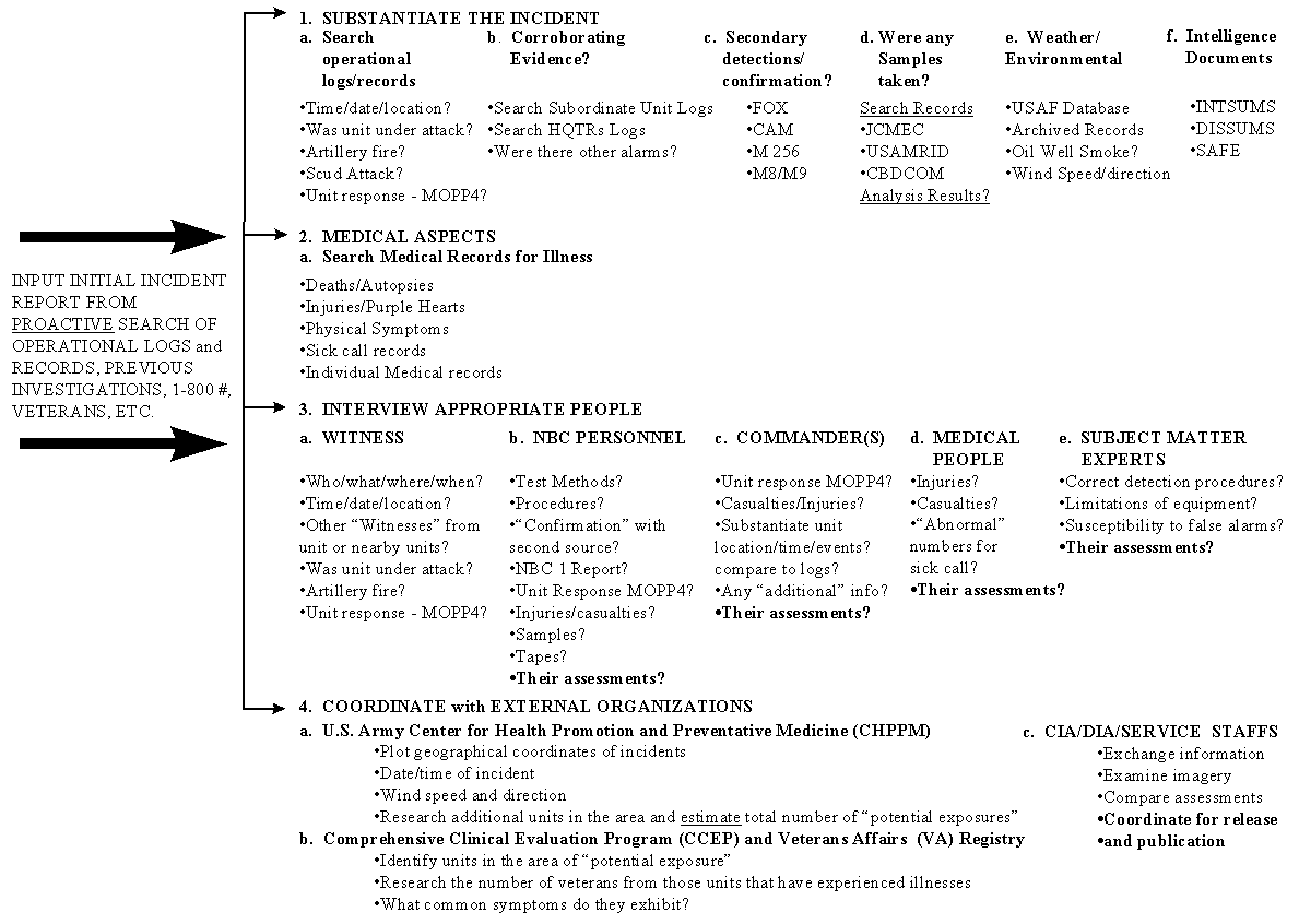 The investigator searches the medical records to determine if personnel were injured as a result of the incident. Deaths, injuries, sicknesses, etc. near the time and location of an incident may be telling. Medical experts should provide information about alleged chemical casualties.
