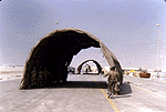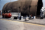 The paint sites established by the 325th at the ports of Ad Dammam and Al Jubayl began operations in December, 1990. The 325th sites consisted of four to six large maintenance tents, with one tent used from time to time for vehicle preparation by vehicle crews. Preparation rarely involved more than spraying off the vehicles with water, occasional light sanding or scraping, and taping and greasing the vehicle windows. The tent flaps were generally left open to allow natural ventilation. Only on occasions when there was a great deal of wind were the tent flaps closed. No engineering ventilation devices, such as fans and blowers, were used in the in-theater painting operations. As a result, there was typically a noticeable cloud of paint overspray outside the maintenance tents. Figure 4 shows four paint tents at Al Jubayl.[79,80]