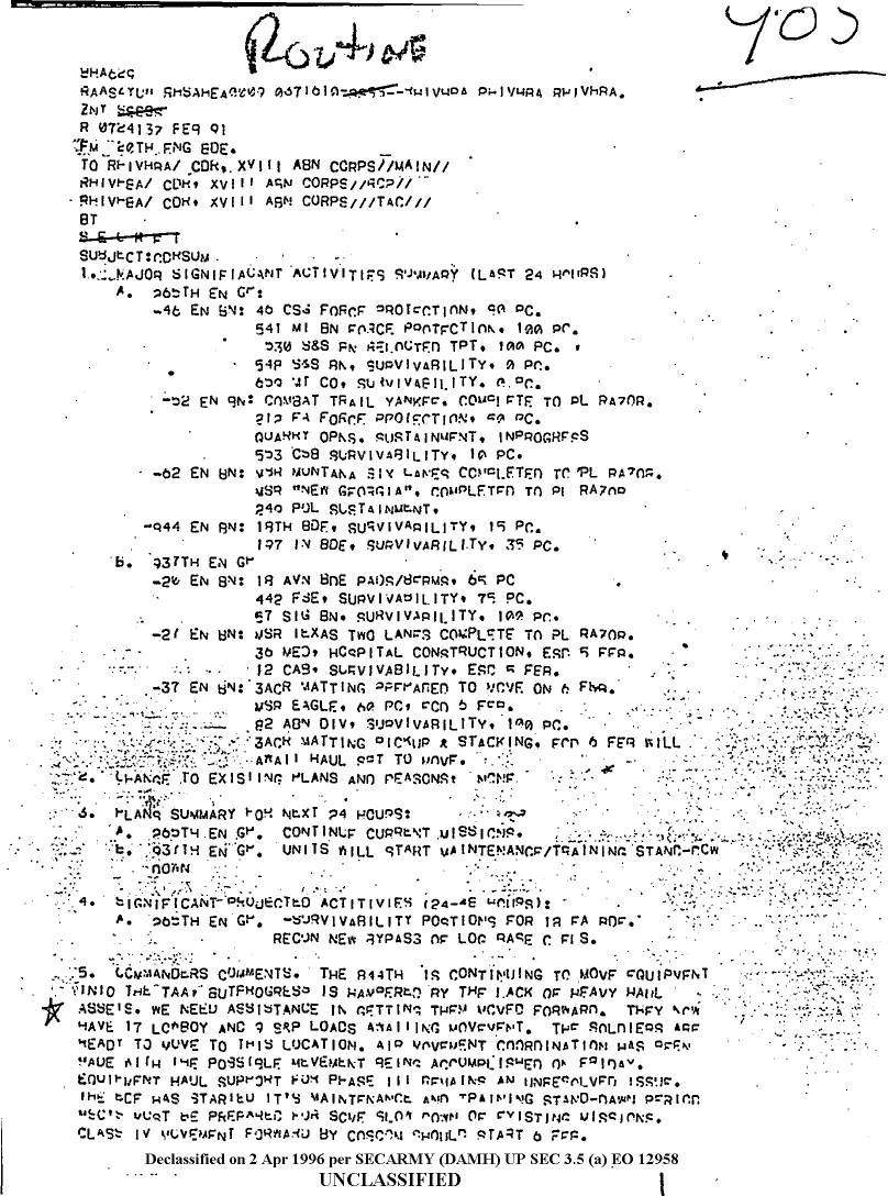 Document 1 f:/Week-08/BX000015/DUTY LOG 20 ENG BDE SITREPS G3 FEB 91/commanders narrative summar:04109619191921