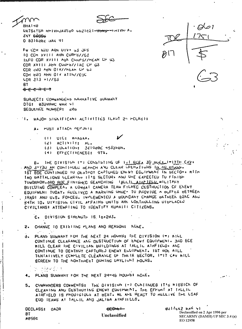 Document 1 f:/Week-08/BX000015/DUTY LOG 82 AB DIV SITREPS MAR 91/commanders narrative summary 03 mar 9:0410961919194