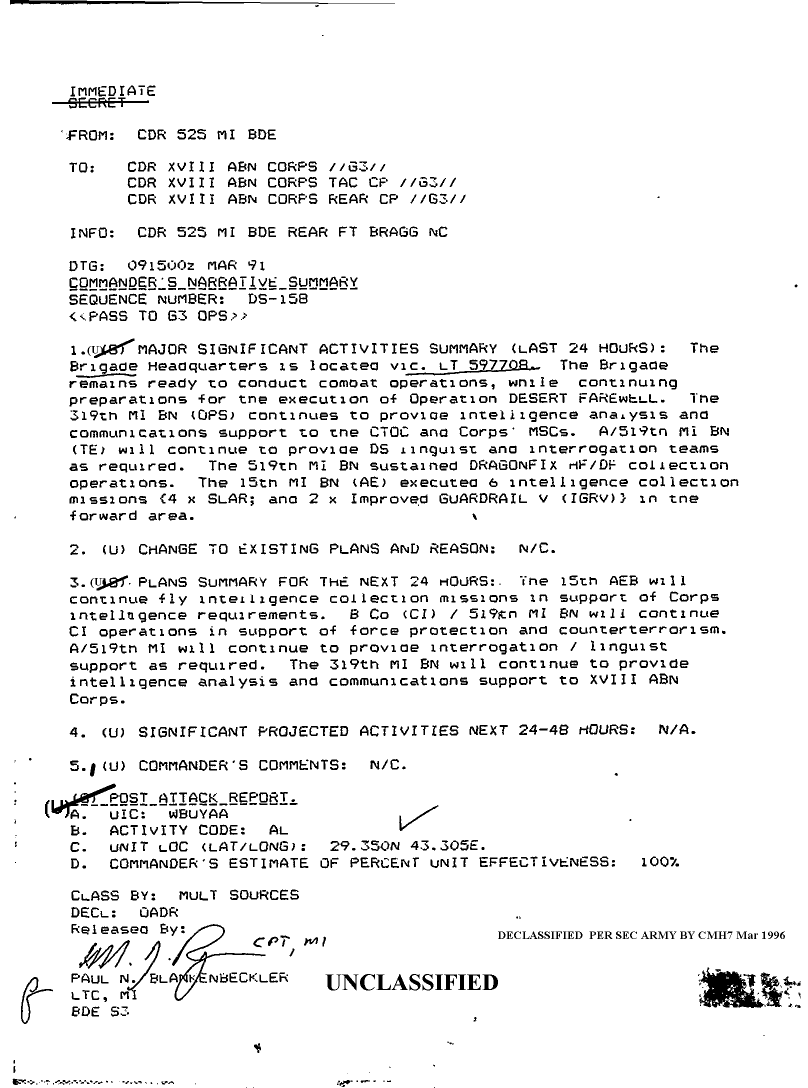 Document 1 f:/Week-08/BX000015/DUTY LOG 525 MI BDE SITREPS G3 MAR 91/comander's narrative summary sequence ds-15:0410961919197
