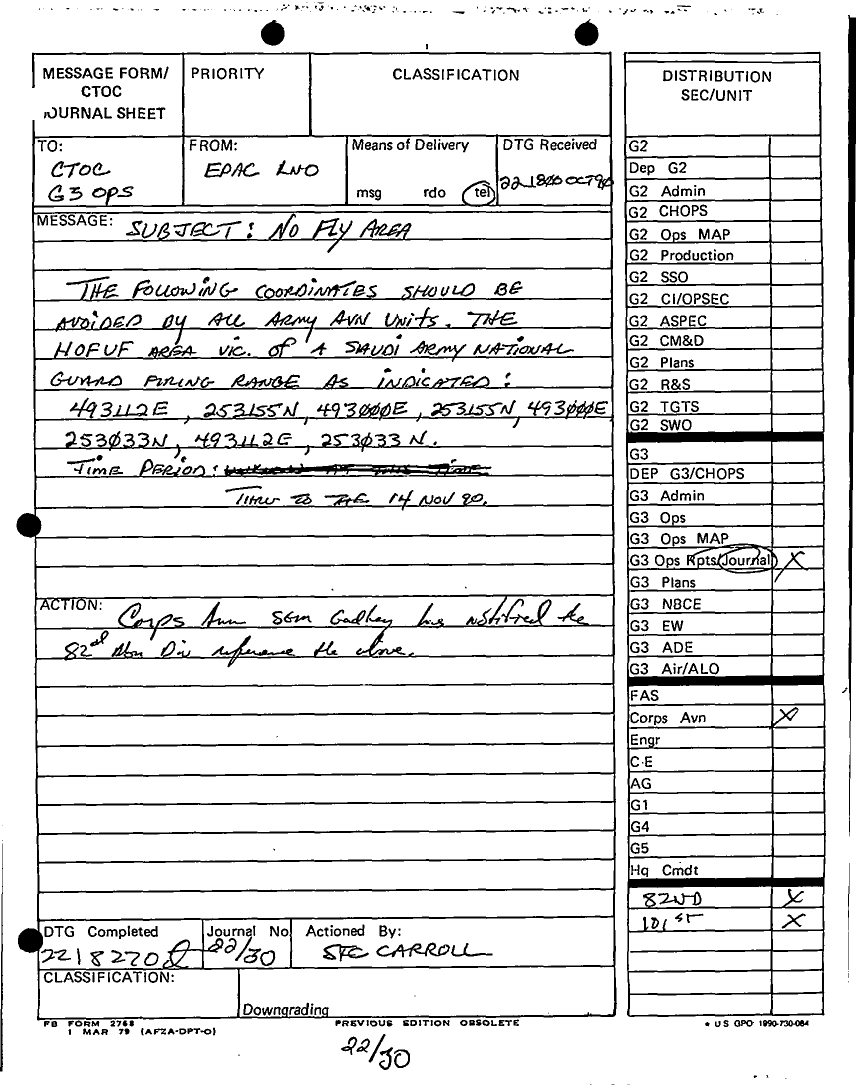 Subject = DAILY STAFF JOURNAL OR DUTY OFFICERS LOG 22 OCT 90