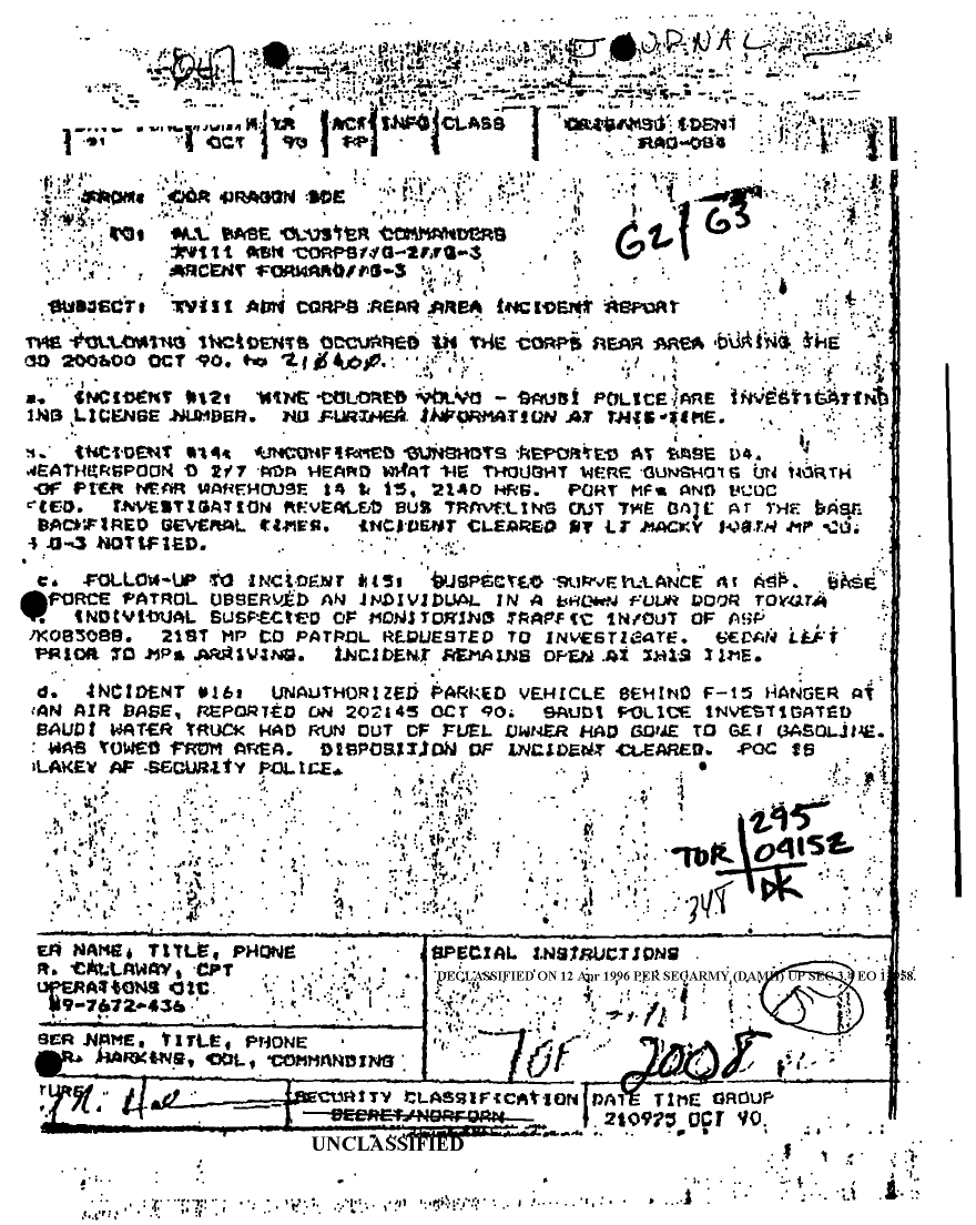 Subject = DAILY STAFF JOURNAL OR DUTY OFFICERS LOG 22 OCT 90