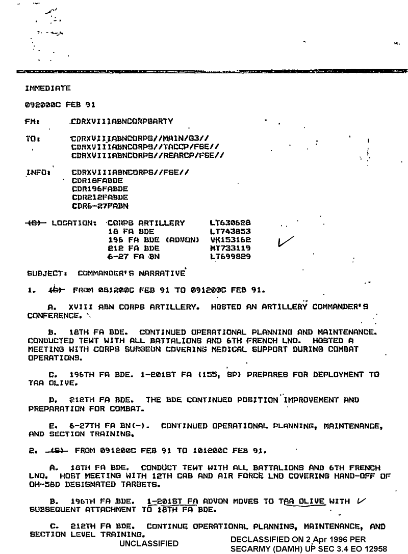 Document 2 f:/Week-08/BX000015/DUTY LOG 18 CORPS ARTY SITREPS G3 FEB 91/commander's narrative 9 feb 91:0415961640001