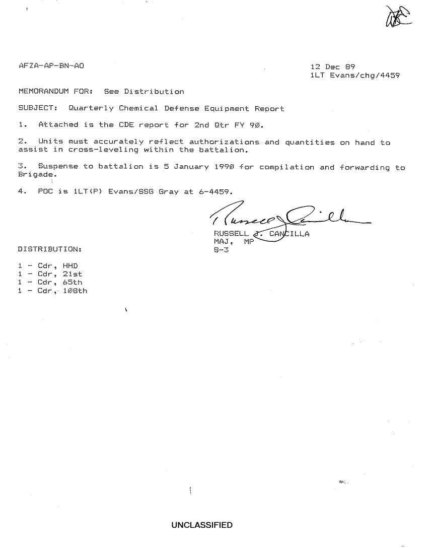 Document 3 f:/Week-15/BX000047/CHEMICAL DEFENSE EQUIPMENT CDE/quarterly chemical defense equipment report:05309618571755