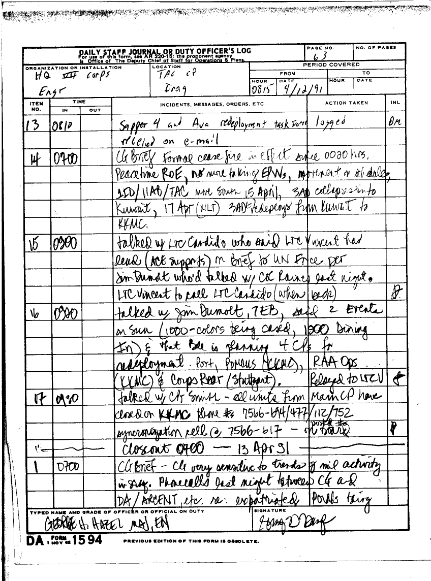 Document 59 f:/Week-25/BX000252/DAILY STAFF JOURNAL 16 MAR TO 13 APRIL 1991 SITREPS/daily staff journal:07199610194645