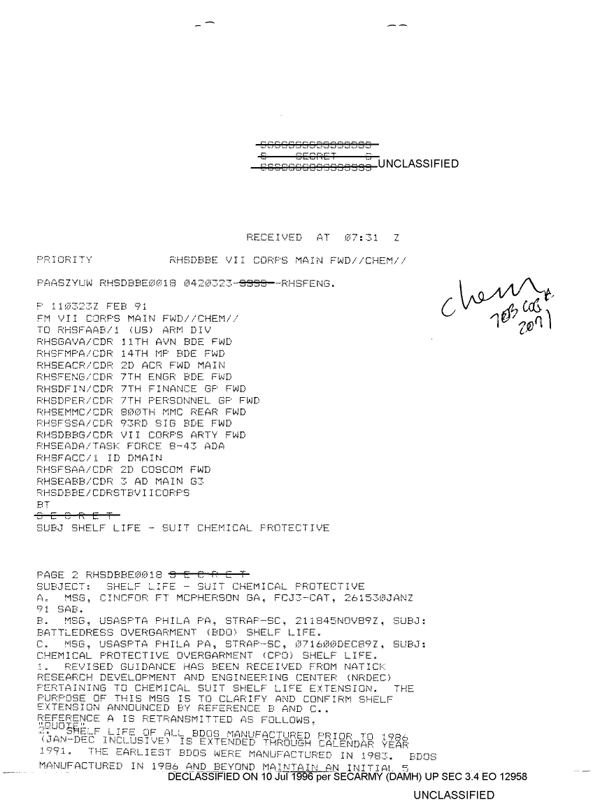 Document 4 f:/Week-25/BX000235/JOURNAL NUMBER 7 5 FEB - 14 FEB 91/shelf life suit chemical protective 11 feb 91:07199610201365