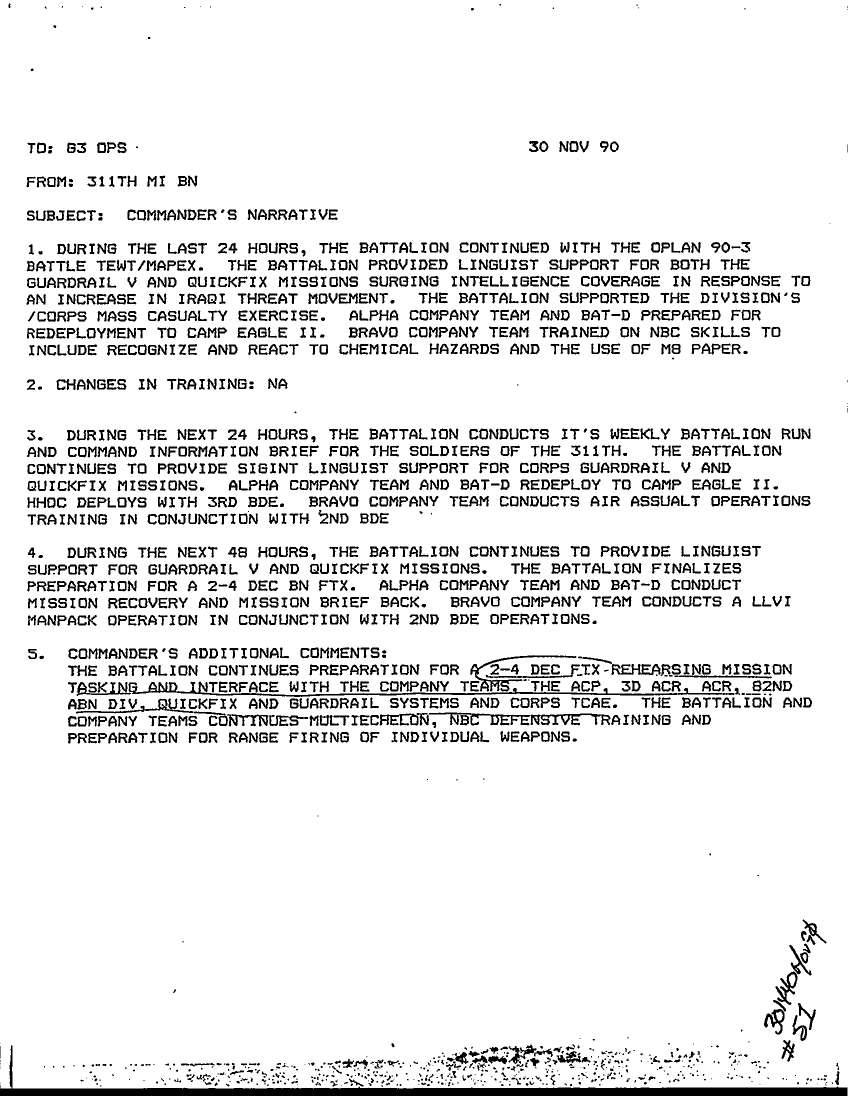 Subject = COMMANDERS NARRATIVE 30 NOV 90