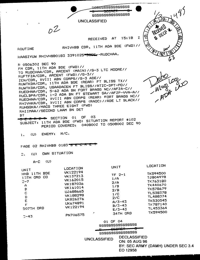 Document 11 f:/Week-29/BX000404/TACTICAL OPERATIONS CENTER LOGS - MSG FILE LOGS 6-7 DEC 90/11th ada bde sitrep 102:08169613341116