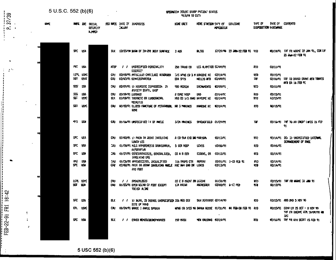 Document 38 f:/Week-31/BX000460/MEDSTAT-SITREPS - FEBRUARY - 2/ods patient status report 22feb91:09139616121511