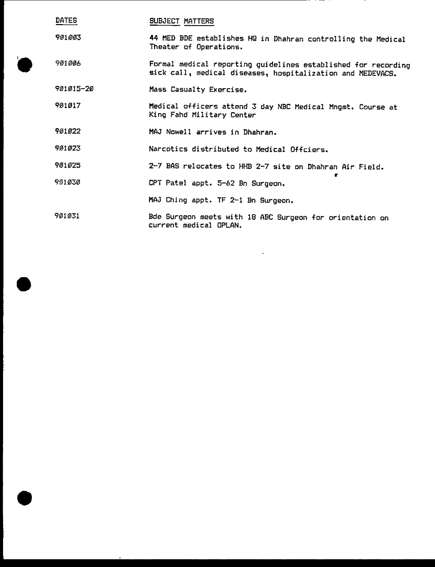 Document 8 f:/Week-33/BX000473/COMMAND REPORTS 11TH ADA BDE LESSONS LEARNED 1 OF 2 PERMANENT DESERT SHIELD-STORM/chronology of medical events for 11th ada bde:09139616123820