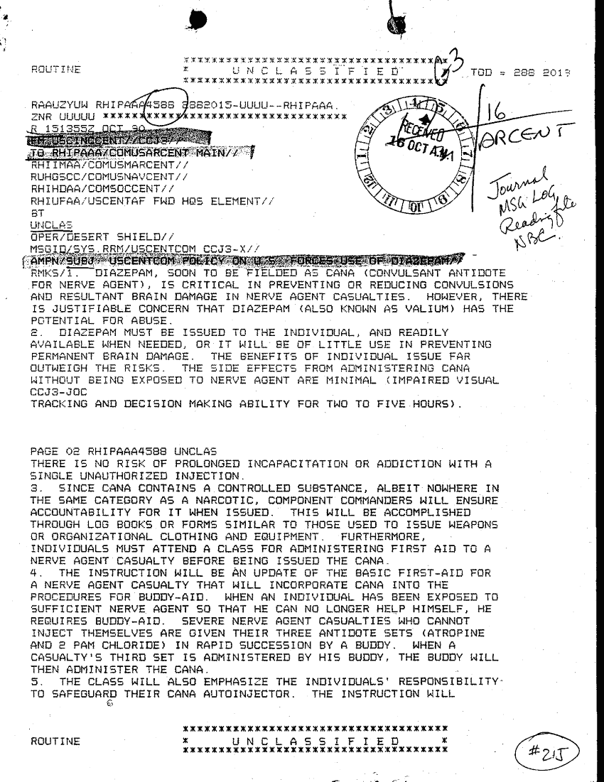 Document 2 f:/Week-31/BX000457/TACTICAL OPNS CENTER LOGS-MSG FILE LOGS 16 OCT 90/uscentcom policy on us forces use of diazepam 1:09069615152820