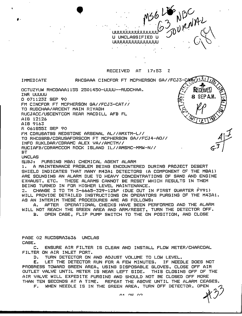 Document 2 f:/Week-32/BX000490/DAILY STAFF JOURNAL ARCENT 7 - 8 SEP 90/msg purging b8a1 chemical agent alarm:09209615583864