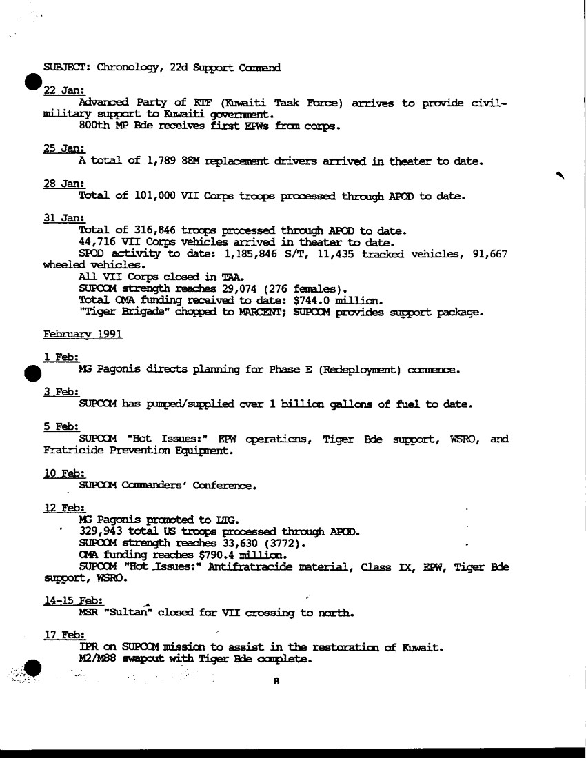 Document 15 f:/Week-33/BX005007/HQS ARCENT WRITTEN AAR 30 MAY 91/chronology 22d spt cmd ops desert shield and sto:09209615585492