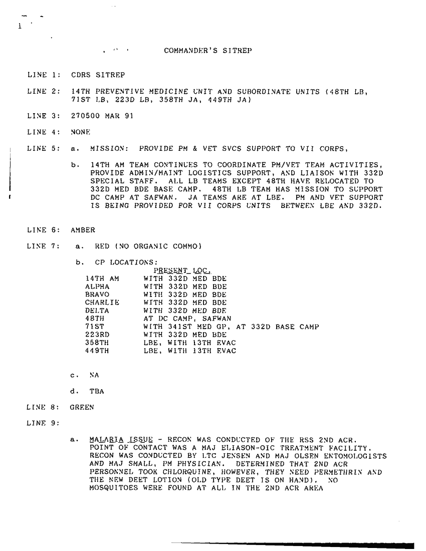 Document 2 f:/Week-34/BX005159/SITUATION REPORTS-DECLASSIFIED-MAR THRU APR 91-2/commanders sitrep 14th preventive medicine 27 ma:092096155906111