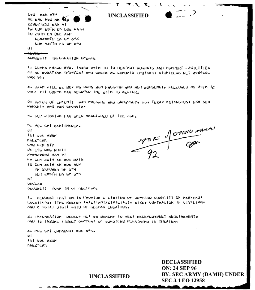 Document 1 f:/Week-18/BX000057/DUTY LOG MAIN CP MESSAGES 20 ENGINEER BDE 6 MAR 91/information update cdr 20th en bde 22 mar 91:10189613573343