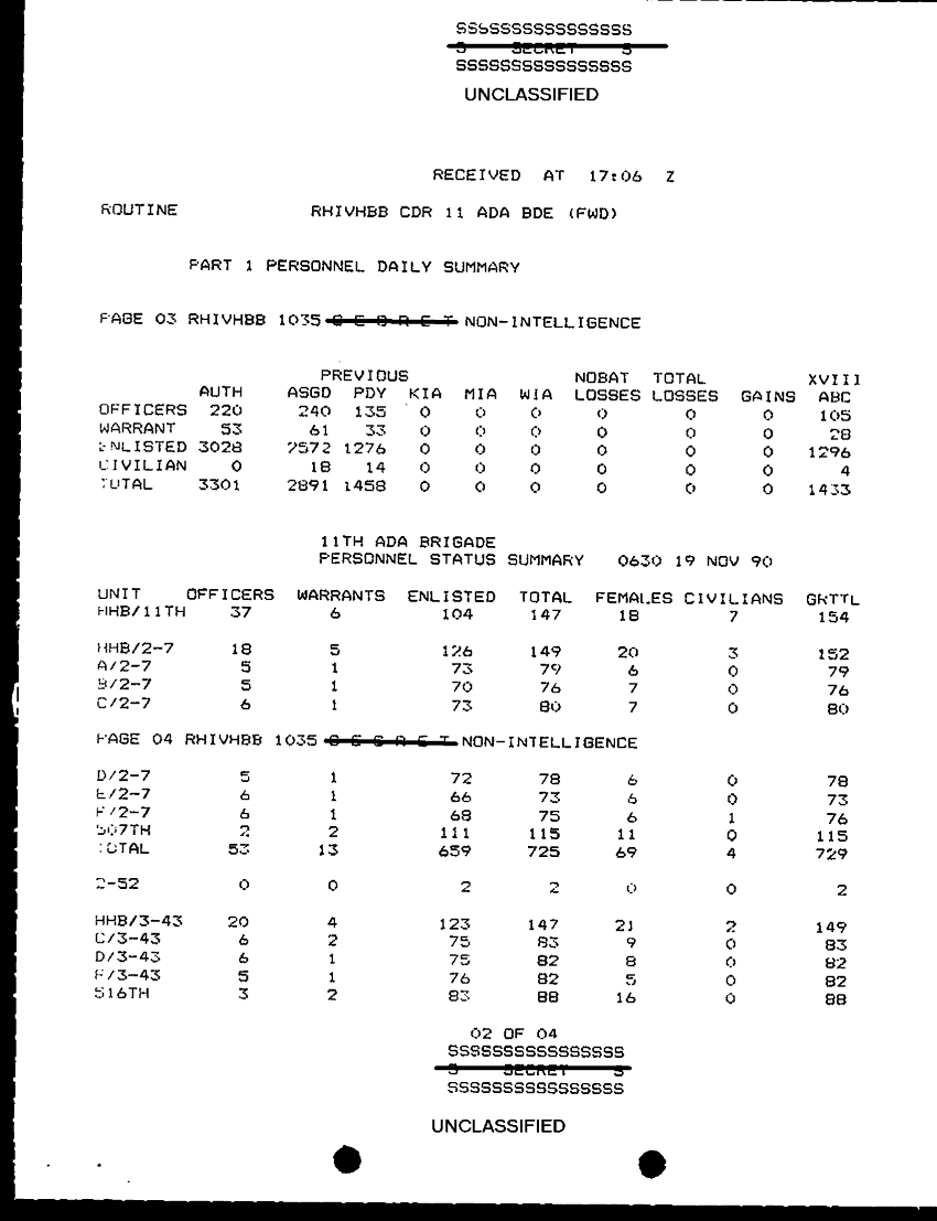 Document 8 f:/Week-29/BX000429/TACTICAL OPERATIONS CENTER LOGS - MSG FILE LOGS 19 NOV 90/sitrep 86 11th ada bde fwd 19 nov 90:10019616505561