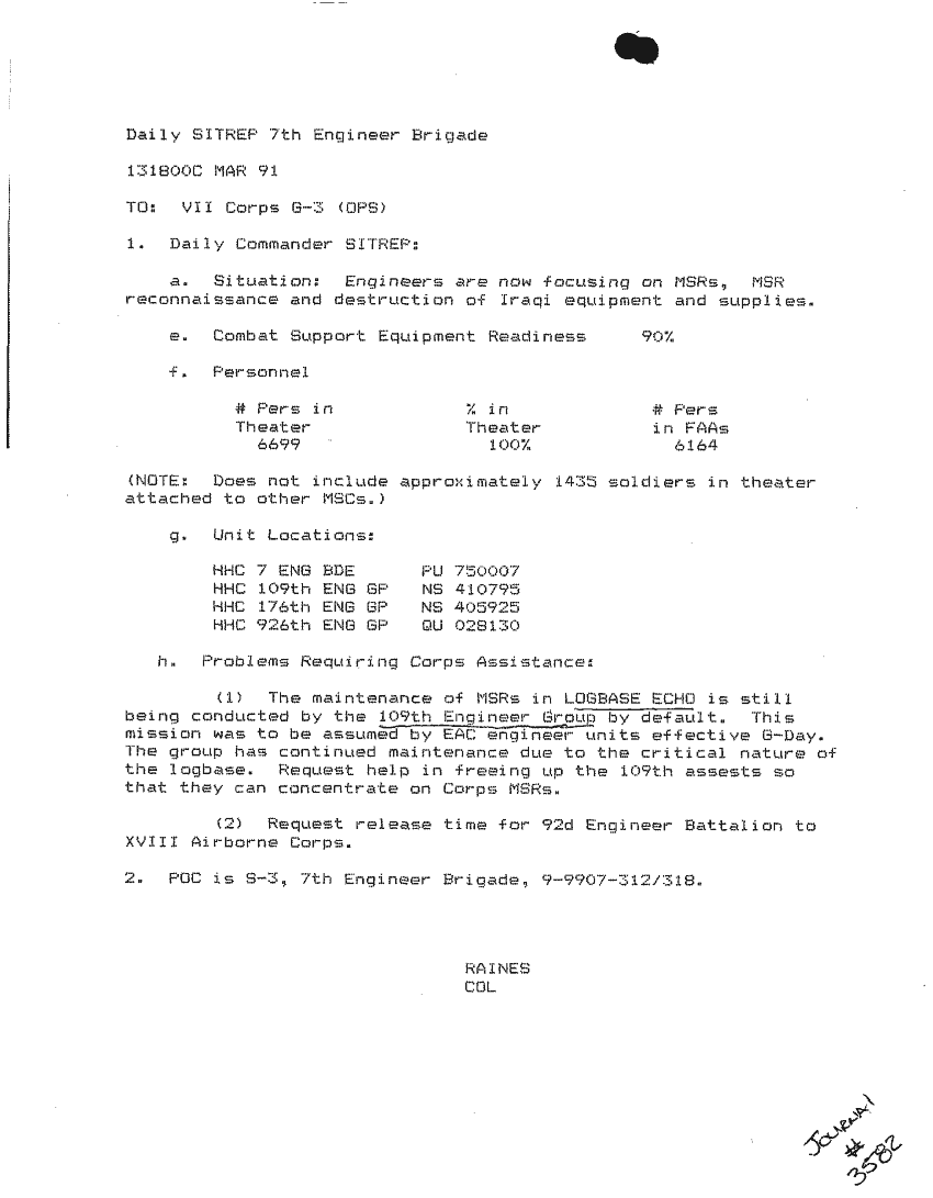 Document 87 f:/Week-24/BX000213/SITUATION REPORTS 7TH ENG BDE 22 DEC 90- 10 APR 91/daily commander sitrep:10019616504540