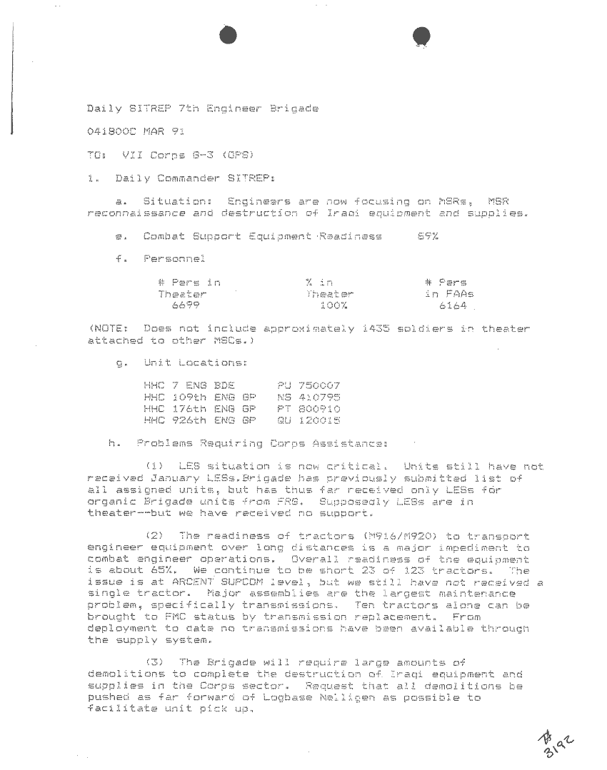Document 87 f:/Week-24/BX000213/SITUATION REPORTS 7TH ENG BDE 22 DEC 90- 10 APR 91/daily commander sitrep:10019616504540