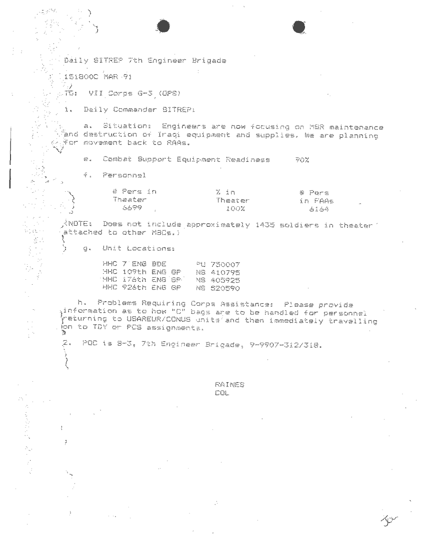 Document 87 f:/Week-24/BX000213/SITUATION REPORTS 7TH ENG BDE 22 DEC 90- 10 APR 91/daily commander sitrep:10019616504540