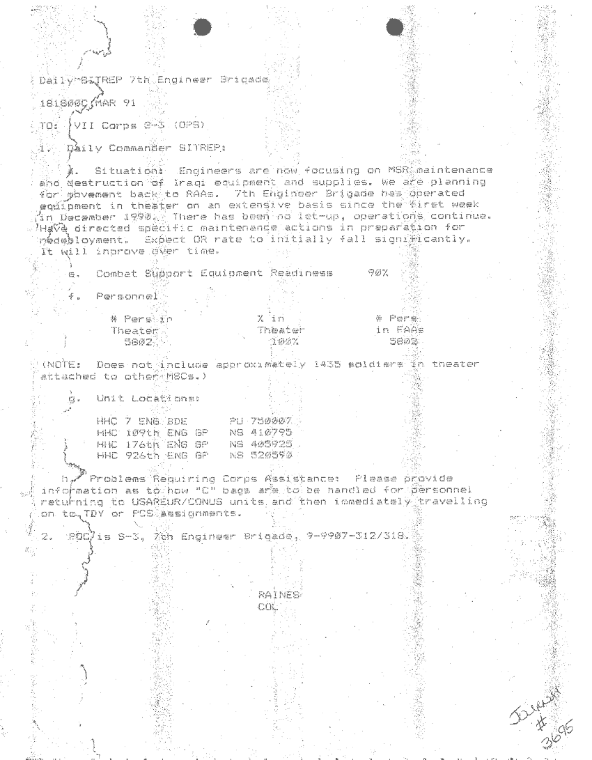 Document 87 f:/Week-24/BX000213/SITUATION REPORTS 7TH ENG BDE 22 DEC 90- 10 APR 91/daily commander sitrep:10259613090426