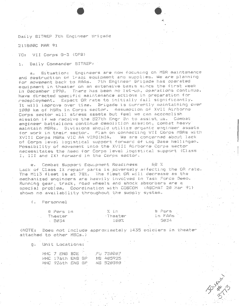 Document 87 f:/Week-24/BX000213/SITUATION REPORTS 7TH ENG BDE 22 DEC 90- 10 APR 91/daily commander sitrep:10259613090426