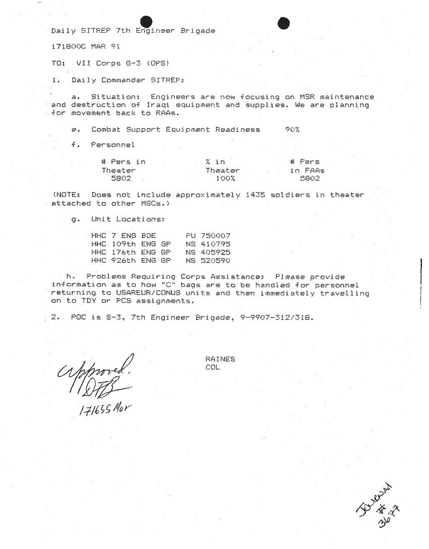 Document 87 f:/Week-24/BX000213/SITUATION REPORTS 7TH ENG BDE 22 DEC 90- 10 APR 91/daily commander sitrep:10259613090426