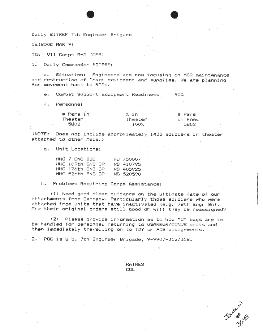 Document 87 f:/Week-24/BX000213/SITUATION REPORTS 7TH ENG BDE 22 DEC 90- 10 APR 91/daily commander sitrep:10259613090426