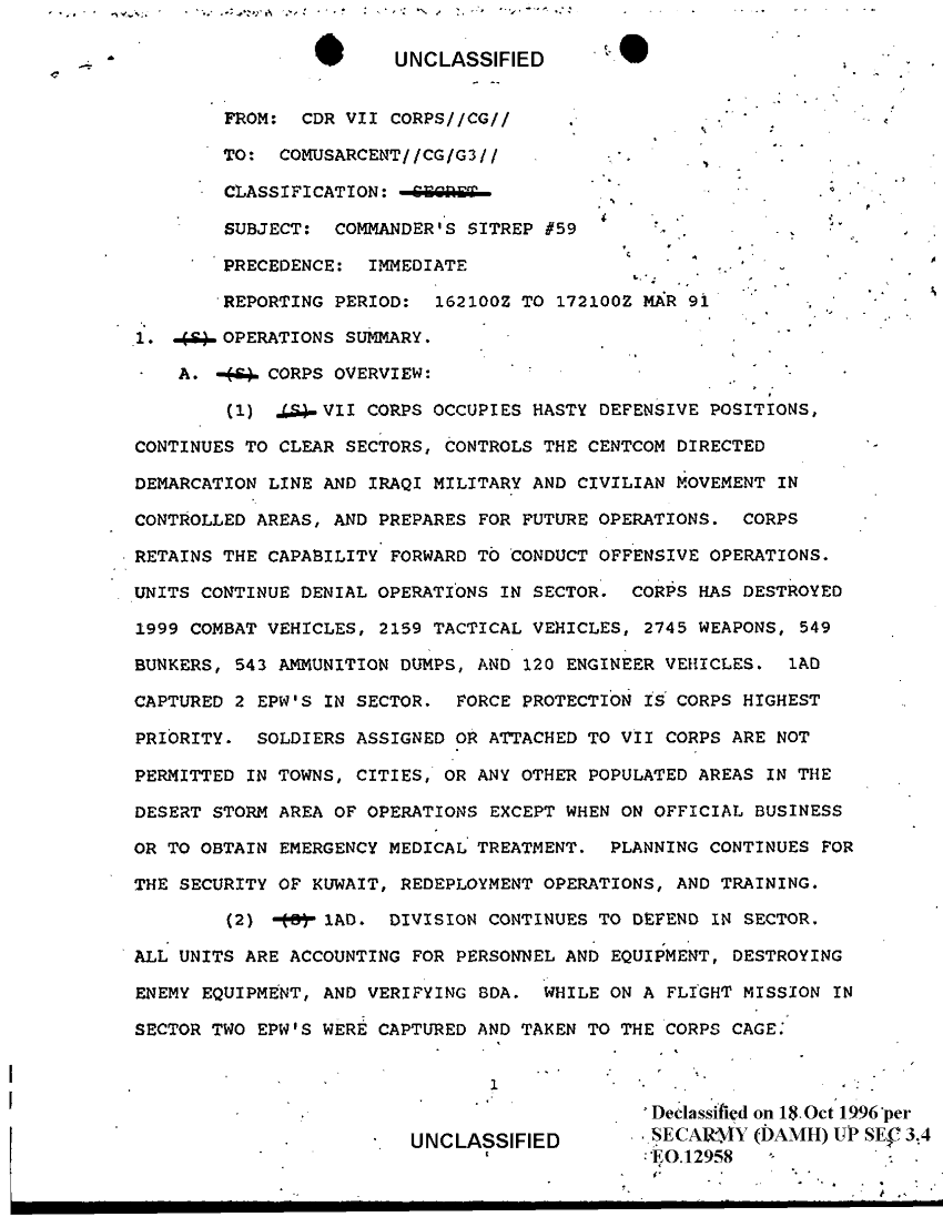 Folder Title = VII CORPS CMDRS SITREP 25-63 DTD 11 FEB THRU 21 MAR 91