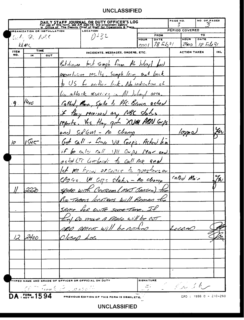 Document 3 f:/Week-28/BX000410/TACTICAL OPERATIONS CENTER LOGS - LUCKY TAC JOURNALS 15-18 FEB 91/daily staff journal lucky tac nbc kkmc 18 feb :11229616372722