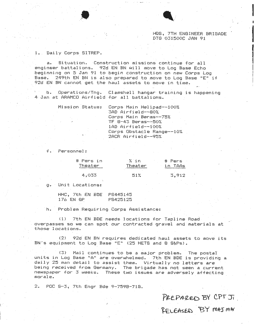 Document 41 f:/Week-24/BX000213/SITUATION REPORTS 7TH ENG BDE 22 DEC 90- 10 APR 91/daily sitrep 7th engineer bde:11089615143325