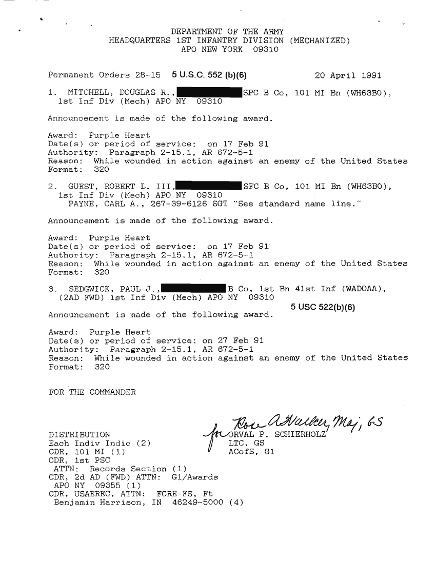 Document 78 f:/Week-26/BX001004/AWARD GUEST ROBERT L III-1/casualty report award of the purple heart:12179611151925