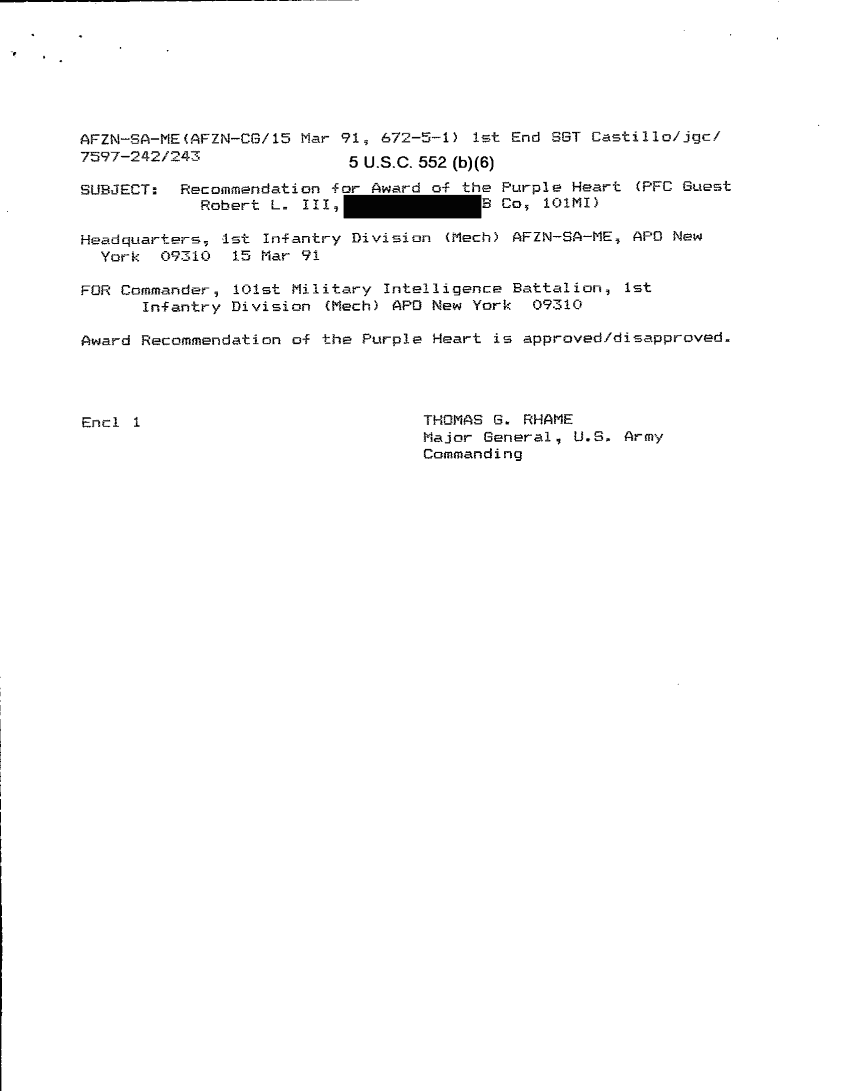 Document 78 f:/Week-26/BX001004/AWARD GUEST ROBERT L III-1/casualty report award of the purple heart:12179611151925