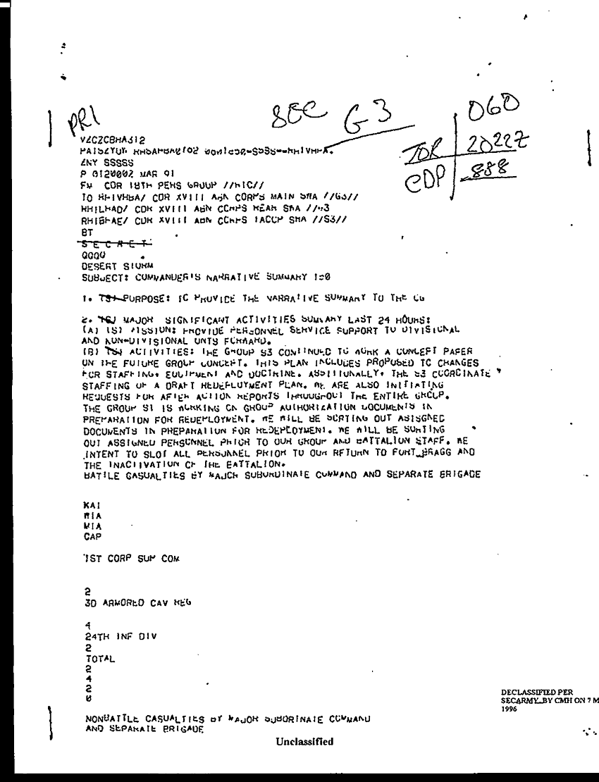 Document 10 f:/Week-08/BX000015/DUTY LOG 18 PER GP SITREPS G3 MAR 91/commander's narraive summary:12269616083520