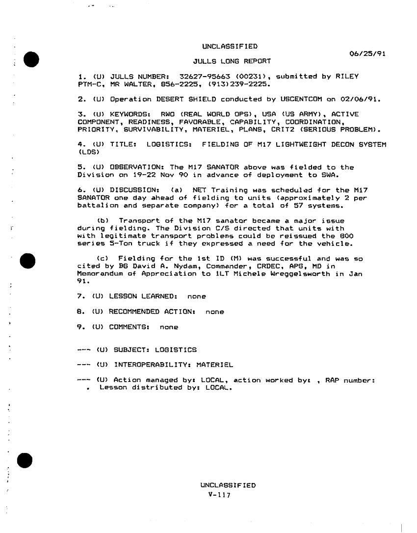 Subject = DESERT SHIELD STORM AFTER ACTION REPORT PHASE 1
