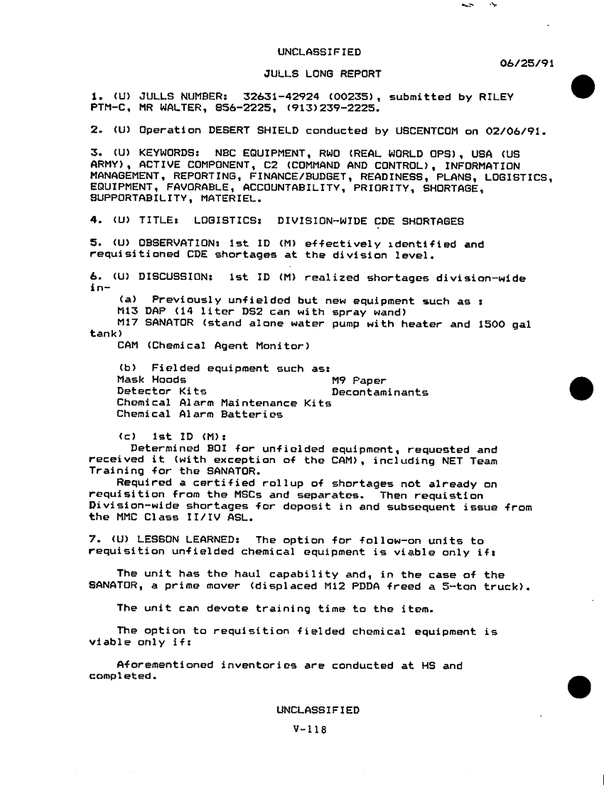 Subject = DESERT SHIELD STORM AFTER ACTION REPORT PHASE 1