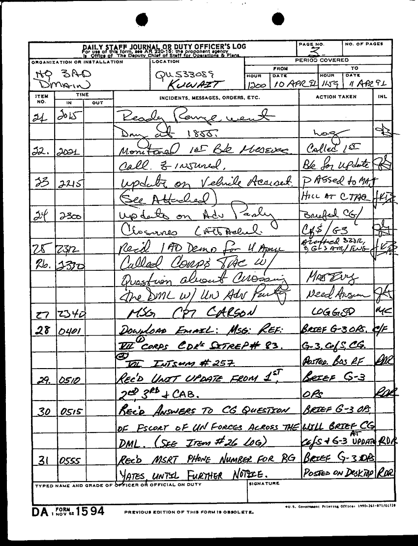 Subject = DAILY STAFF JOURNAL LOG 10 TO 11 APR 91