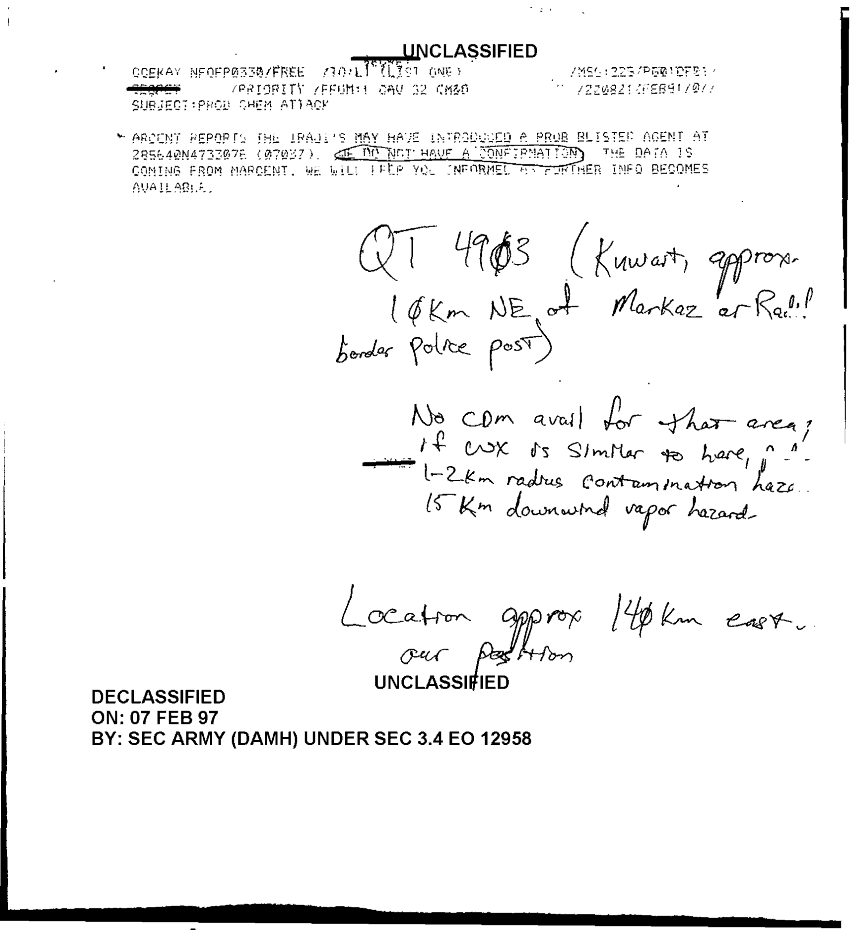 Document 1 f:/Week-49/BX001121/DAILY STAFF JOURNALS 1CD 14 -28 FEB 91/probable chem attack not confirmed 22 feb 91:03069709500626