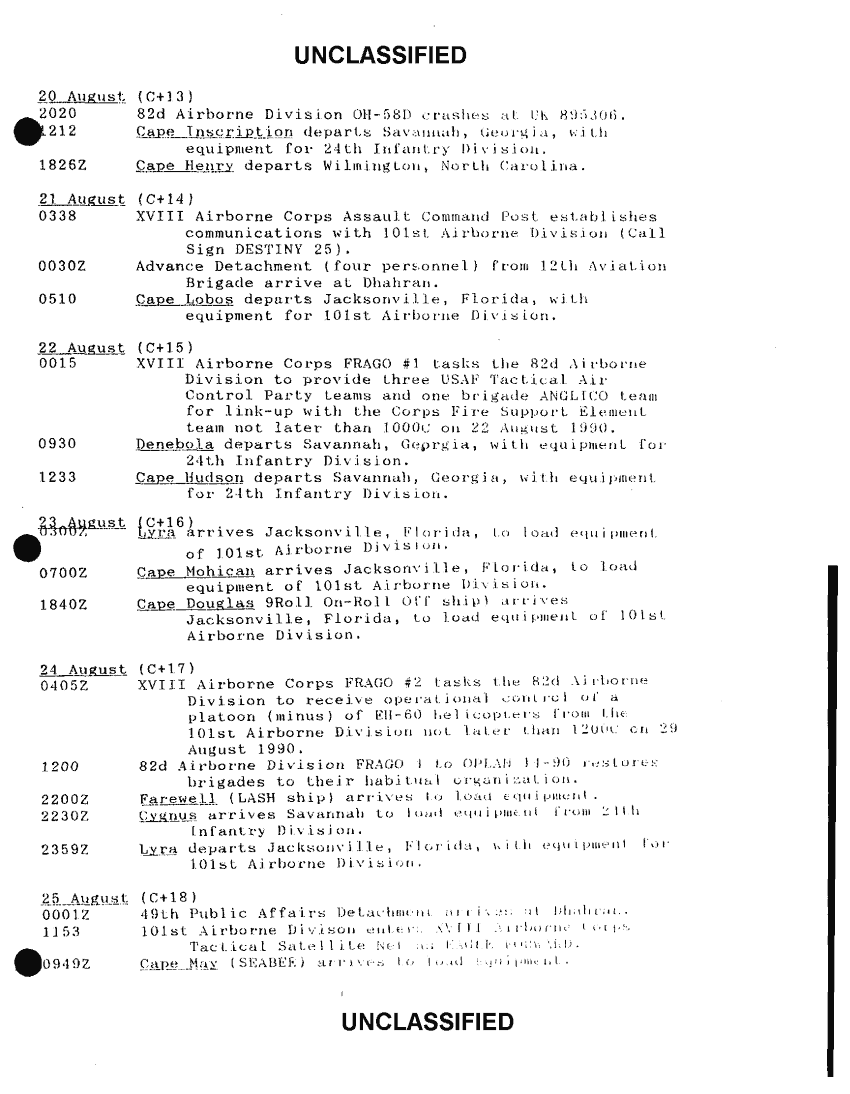 Subject = XVIII AIRBORNE CORPS OPERATION DESERT SHIELD CHRONOLOGY