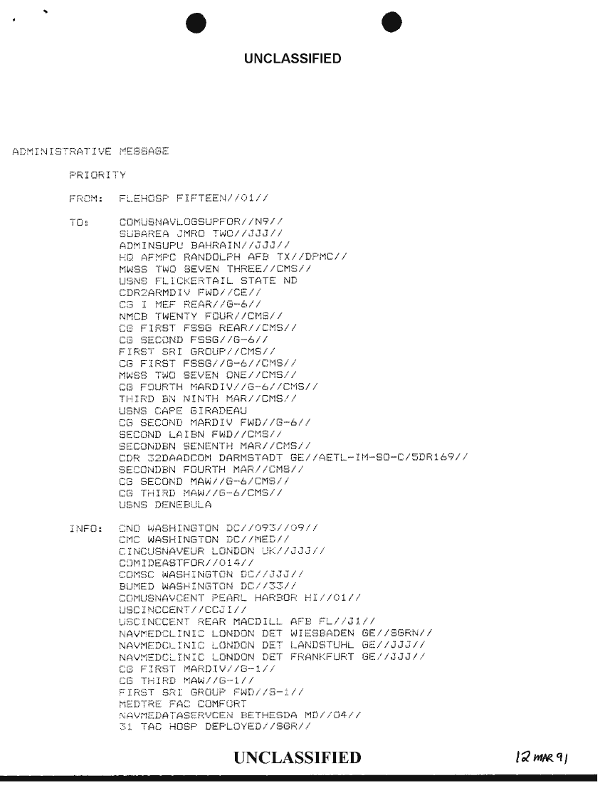 Document 4 f:/Week-37/BX303811/VARIOUS NAVAL MESSAGES FOLDER 6/daily patient status report 12 mar 91 flehosp :0102970936114