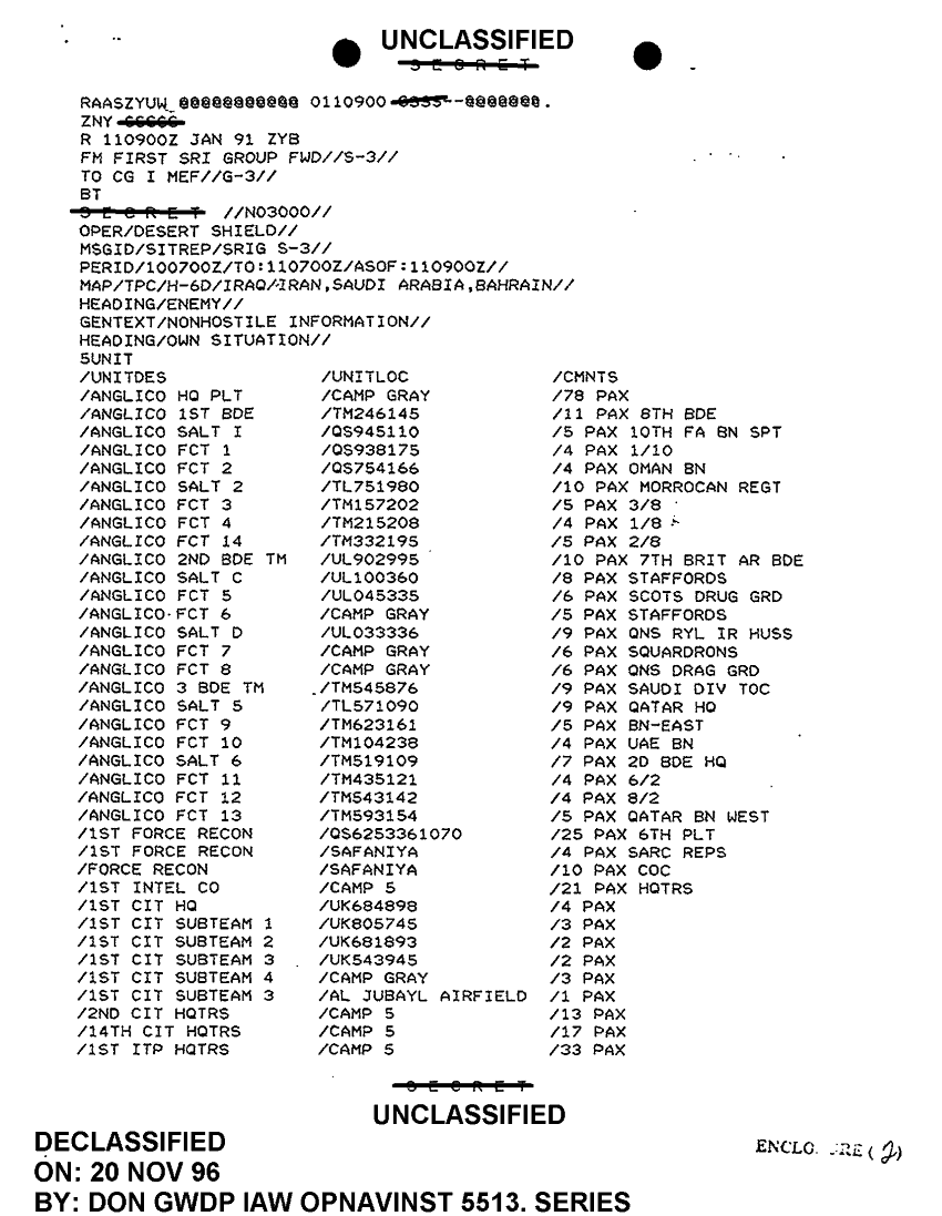 Document 5 f:/Week-38/BX600020/COMMAND CHRONOLOGY 1ST SURVEILLANCE RECON INTEL GROUP JAN 1991 2 OF 2/msgid sitrep srig s 3 11 jan 91:12069615400918