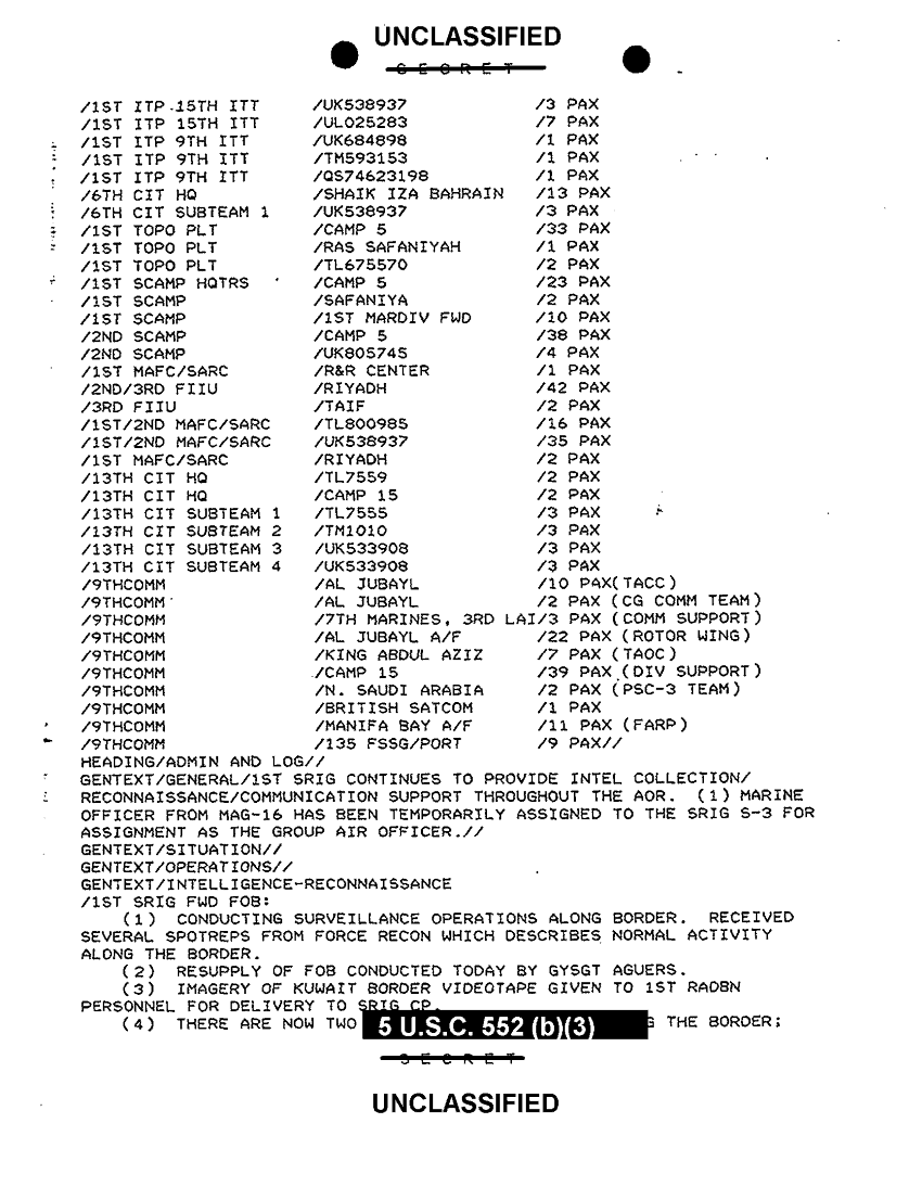 Document 5 f:/Week-38/BX600020/COMMAND CHRONOLOGY 1ST SURVEILLANCE RECON INTEL GROUP JAN 1991 2 OF 2/msgid sitrep srig s 3 11 jan 91:12069615400918